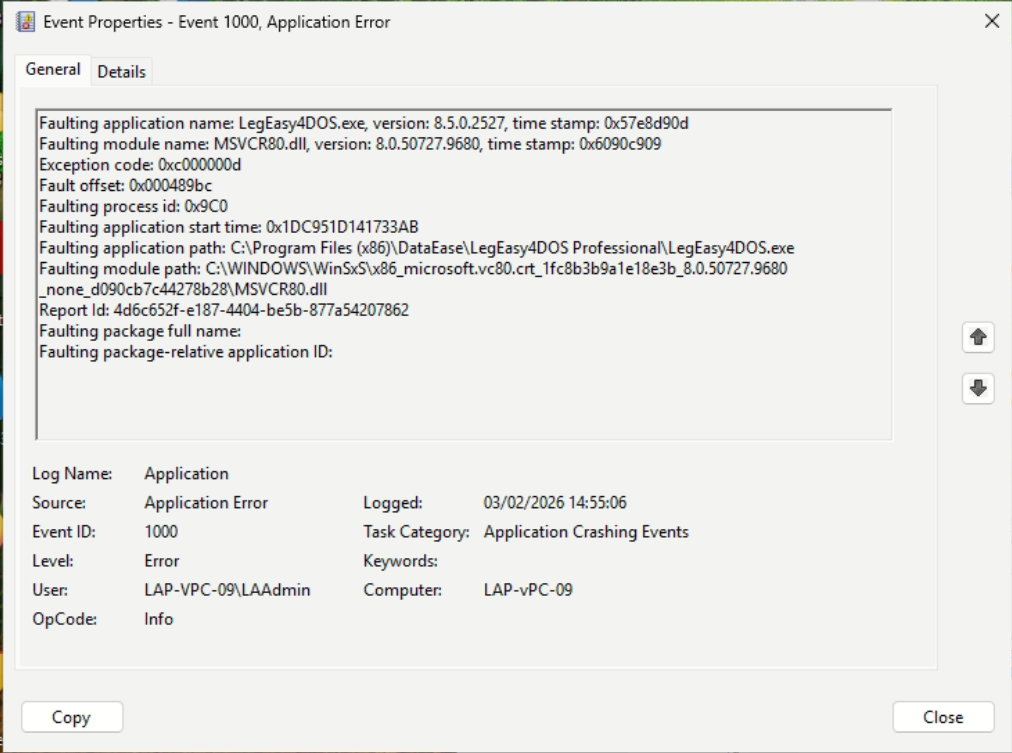 Hi I am getting the attached error when running LegEasy4DOS on a windows 11 PC. Has anyone experienced this before and knows what causes it? I have installed the product on 2 other PC's with the same setup without fault. On this particular PC if you try to launch LegEasy4DOS it appears nothing happens but you can see the attached error in event viewer.